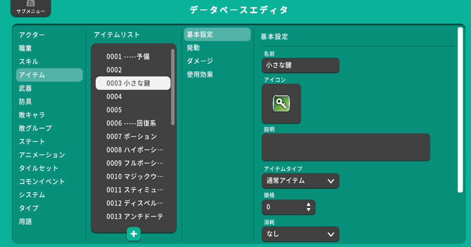 なお、アイテムIDとはデータベースのアイテムを作成した時にアイテムリストに書かれた4桁の数字です。例えば上記画像であれば、0003小さな鍵なので、小さな鍵のアイテムIDは「3」となります。