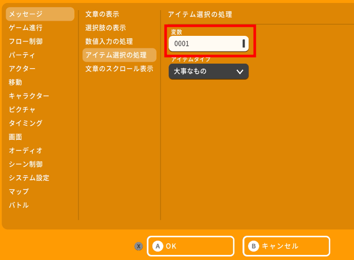 まずはプレイヤーが選択したアイテムのIDをどの変数に入力するかを決めていきます。