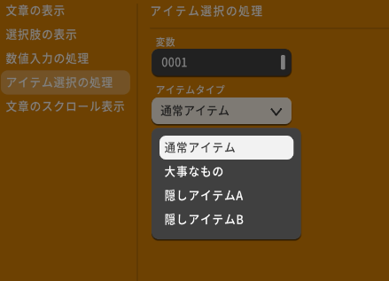 隠しアイテムは所持しているにも関わらず、プレイヤーが所持状況を確認できないアイテムです。隠しアイテムを使うと、六択が上限の「選択肢の表示」以上の選択肢をプレイヤーに選択させることができます。