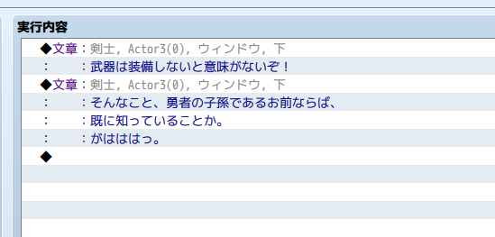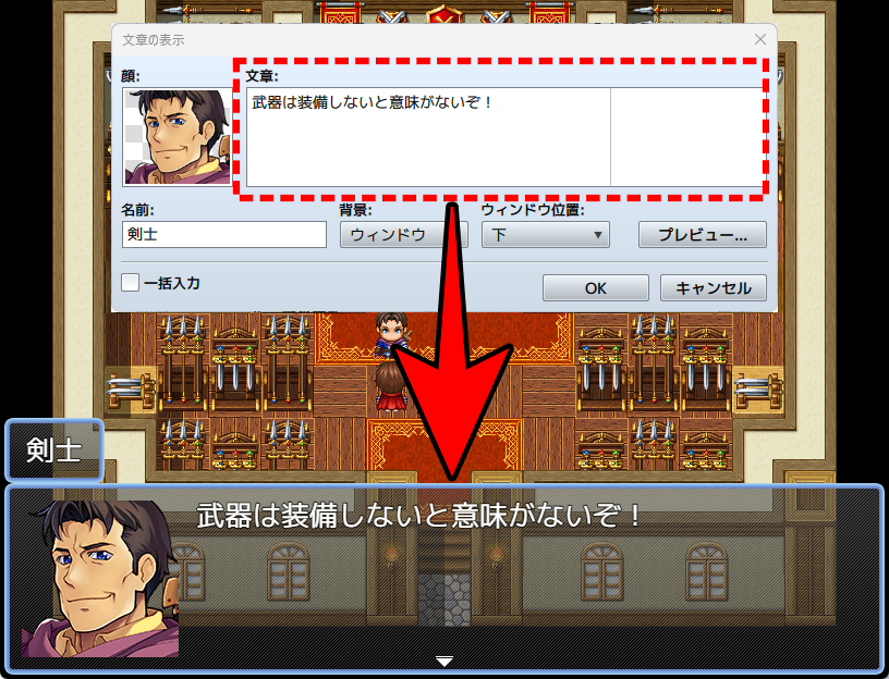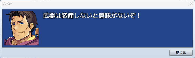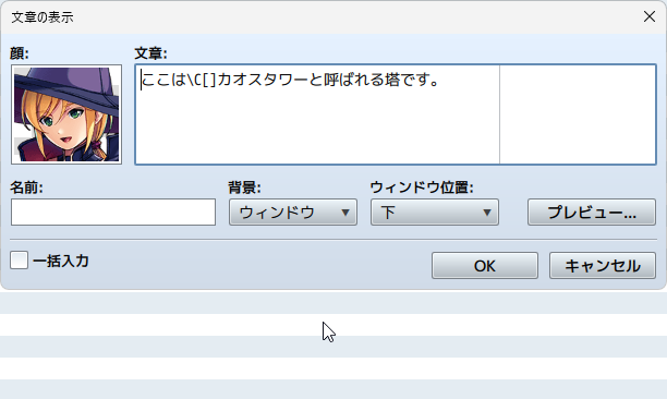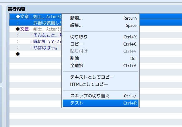 実際にゲームの画面風にチェックしたい場合は、一度「OK」で実行内容にコマンドを追加し、実行内容に追加されたコマンドで右クリック→テストを選びましょう。