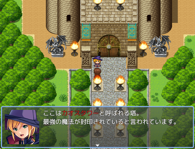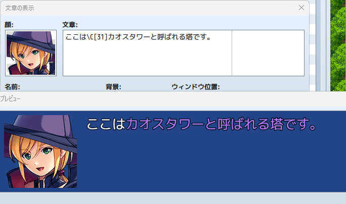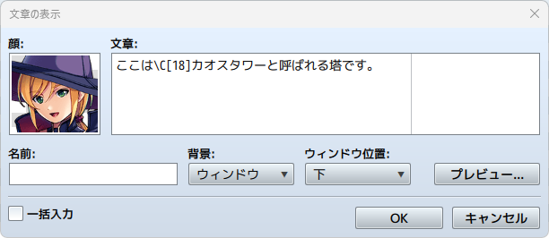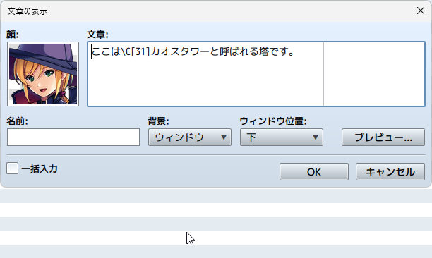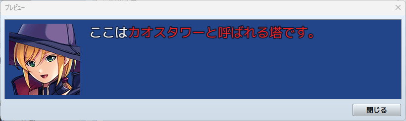 なお、「文字の色」の制御文字は「以降の文字を指定した色に変える」命令になり、設定した文章の表示命令ではその色が継続して続いてしまいます。特定の部分だけ強調するために色を変えたい場合は「ここは\C[31]カオスタワー\C[0]と呼ばれる塔です」のように、変えたい文字の冒頭で変えたい色を指定した制御文字を入れ、もとに戻したいタイミングで「\C[0]」(文字の色で色番号0を入力した制御文字)を入れてあげましょう。