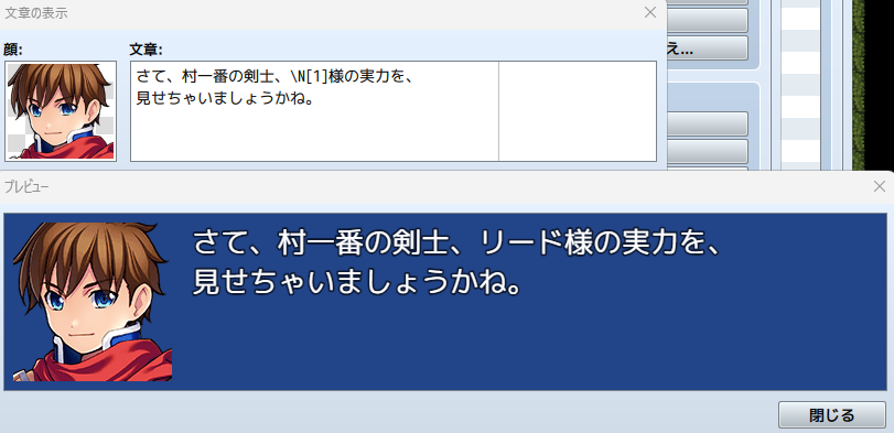 例えば初期プロジェクトではアクター0001番が「リード」というキャラクターになっているため、「\N[1]」と入力すると、プレビューや実際のゲームでは次のような表示になります。