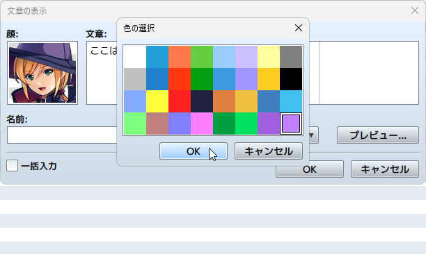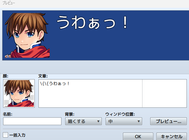 | 一括入力 | 連続して同じ顔・名前のキャラが会話する設定を入力する時に役立つ、上級者向けの機能です |