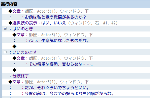 さらに、選択肢に応じて分岐したイベント内に別の文章の表示を設定すると、選択肢によって異なる会話展開が起こる仕掛けも作れます。