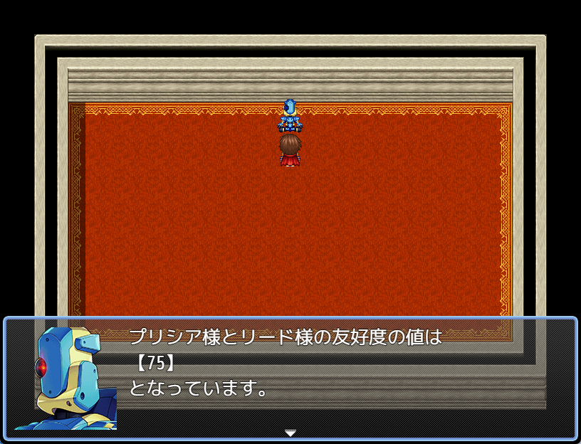 例えば友好度の数字を変数で記録して「友好度システム」を作るケースを考えてみましょう。プレイヤーの行動によって変動する友好度の値を「変数」で記録しておきます。プレイヤーが友好度を確認できるような機能を作る時、文章の表示を使って「友好度の値:\V[番号]」といった文章の表示を作るだけで実装することができます。