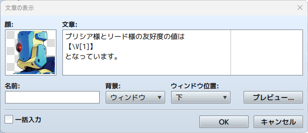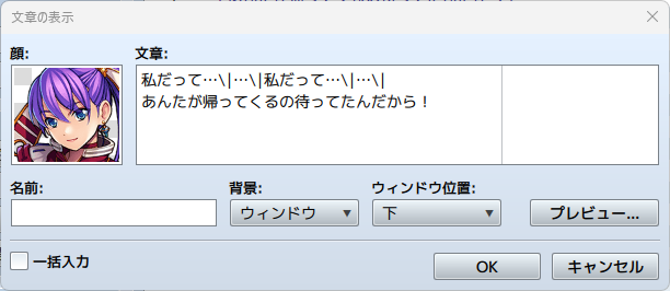 文章の表示は通常4行までしか入力できません。ですが、同じキャラが会話を続ける場合など、連続して会話を入力したいこともあるはずです。そういった時に役立つのが「一括入力」のチェックボックスです。