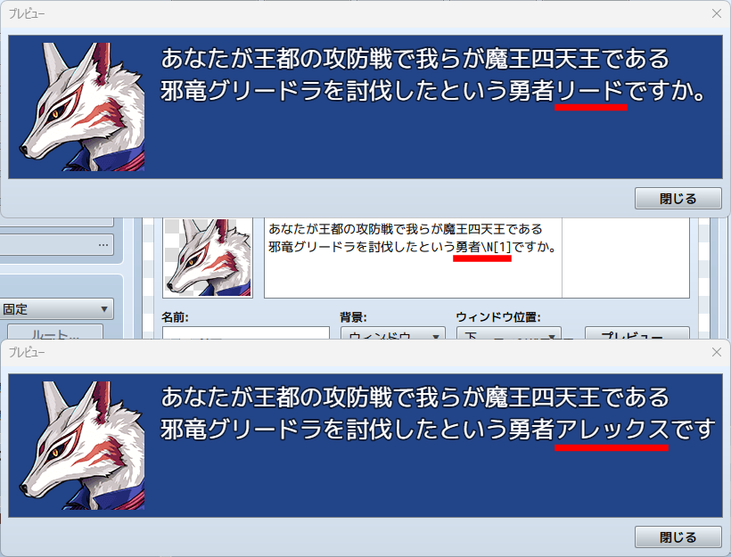 アクターの名前をプレイヤーが変更できるような会話にも「\N[数字]」を使うことで会話表現ができます。